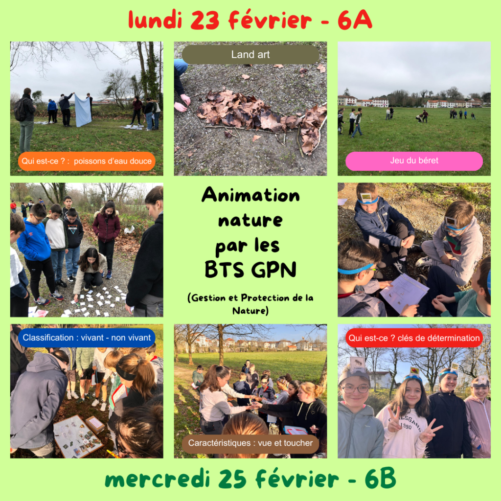 Comme chaque année, les étudiants de BTS GPN ont proposé une animation Nature de 3 heures destinée à nos élèves de 6e.